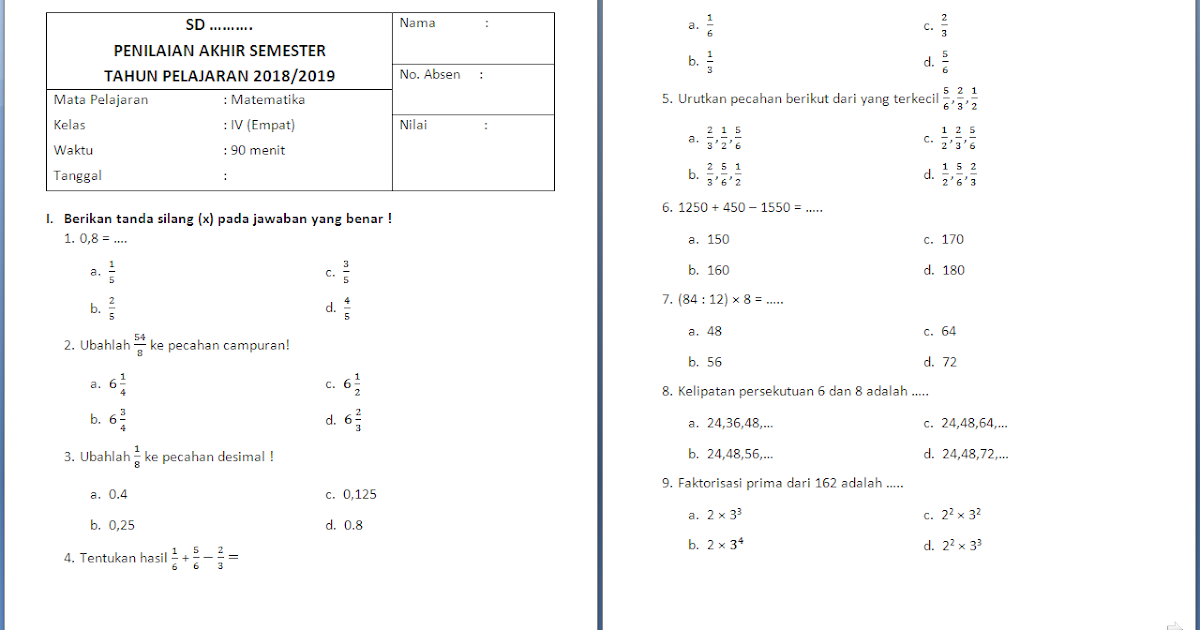 Contoh Soal Pecahan Kelas 5 Semester 1 Kurikulum 2013 Kumpulan Soal Pelajaran 8