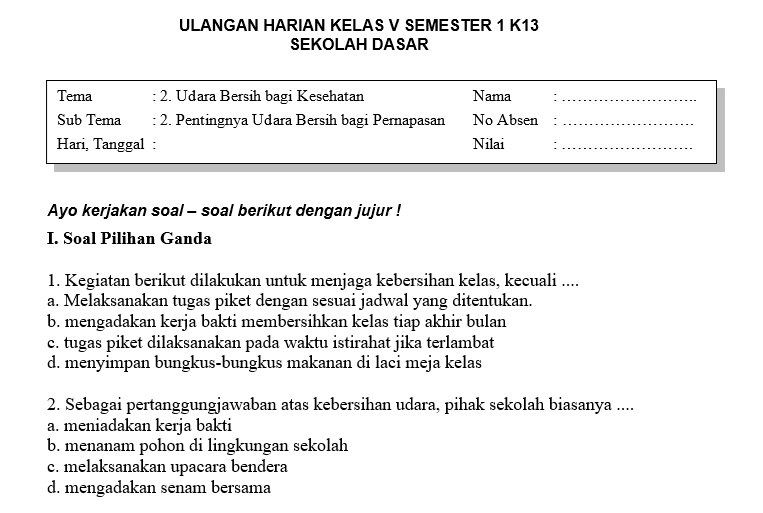 Soal Penilaian Harian Kelas 5 Tema 2 Subtema 2 Dan Kunci Jawaban Sekolahdasar Net