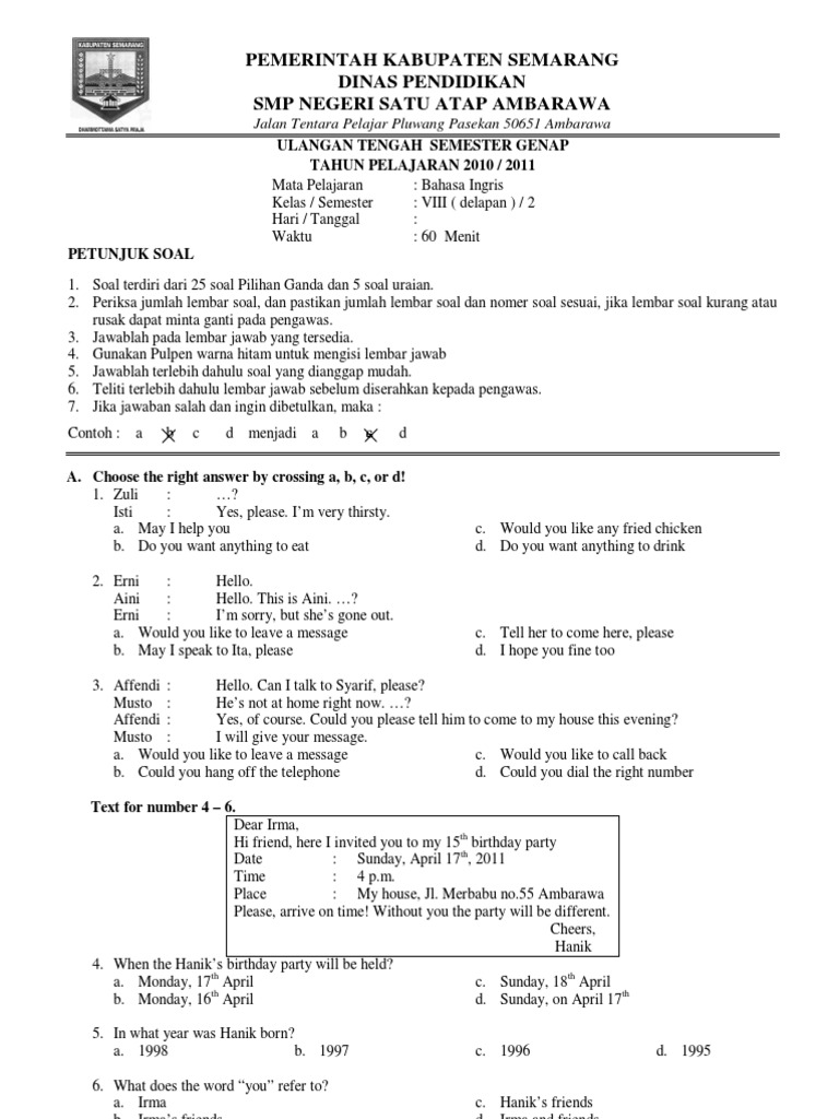 Download Soal Pts Uts Bahasa Inggris Kelas 8 Semester 1 Smp Mts Kurikulum 2013 Tp 2020 2021 Sdn Sobang 2